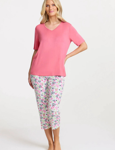 Pyjamas fremstillet af blød bambusviskosejersey for ekstra komfort. Ensfarvet top med V-udskæring og korte ærmer. Mønstrede bukser med elastisk linning for en afslappet pasform, perfekt til en hyggelig aften derhjemme eller en god nats søvn.