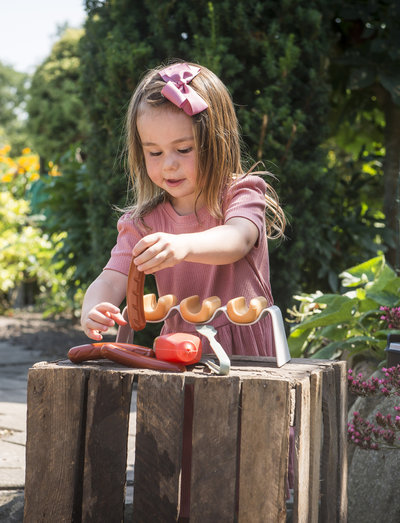 Med dette sjove pølsesæt kan man lege pølsevogn eller lave grillmad eller aftensmad i haven. Det er sjovt at løbe rundt udenfor, men det gør alle sultne. Så hvorfor ikke stille familiens sult med en hjemmelavet hotdog? Du kan sagtens inddrage de andre Green Garden-sæt i din leg - de understøtter alle udendørs leg, læring og udforskning. Kombiner hotdog-sættet med grillsættet, og inviter endnu flere mennesker udenfor til middag. Green Garden opfordrer børn til at lege og engagere sig i daglige gøremål, som f.eks. at passe en køkkenhave. Mellem opgaverne skal der selvfølgelig være tid til en pause i et hyggeligt hjørne af haven - gerne med en lækker hotdog i solskinnet. Hotdog-sættet er produceret i Danmark af dantoy og fremstillet af Svanemærket plast. Sættet består af 9 dele i nye, rolige Green Garden-farver. Anbefalet aldersgruppe for dette produkt er 2+ år. Fremstillet i Danmark Indeholder ingen skadelige giftstoffer Tåler opvaskemaskine Svanemærket - til gavn for sundhed og miljø. Læs mere på: www.ecolabel.dk/en/about/the-nordic-swan-ecolabel-and-eu-ecolabel Hotdog-sættet er fantastisk at kombinere med andre sæt fra Green Garden, f.eks. grillsættet, så du kan invitere endnu flere mennesker til din grillfest.