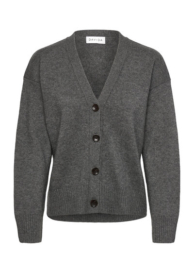 V-neck flat-knitted cardigan with wide large decorative button front. Straight boxy fit. Straight sleeves with ribbed cuffs.