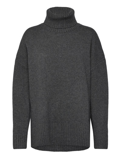Denne striktrøje med rullekrave har en afslappet silhuet, der giver både komfort og stil. Den oversized pasform og ribdetaljerne ved kanten og manchetterne tilføjer et strejf af tekstur til dette hyggelige stykke.