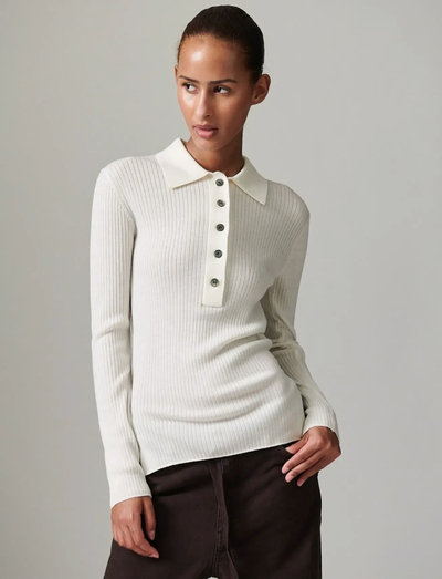 Denne ribstrikkede trøje har en klassisk polokrave og en knaplukning, hvilket giver et raffineret, men komfortabelt look. De lange ærmer og den figursyede silhuet gør den til et alsidigt stykke tøj, der kan bruges alene eller som et lag.