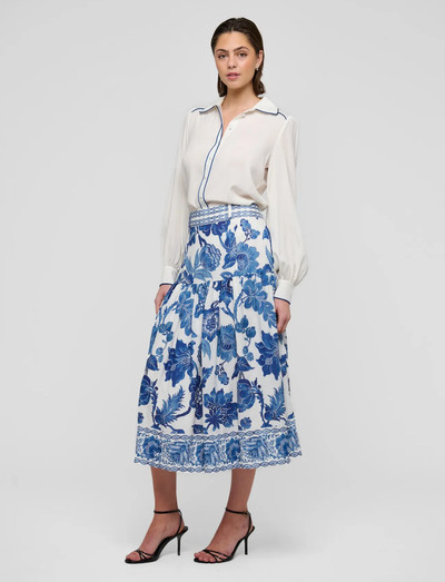 Denne maxi-nederdel har et etagedesign, der giver en flydende silhuet. Det gennemgående blomsterprint tilføjer et elegant touch, hvilket gør den til et bemærkelsesværdigt stykke.