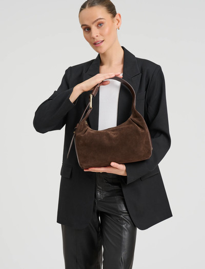 Denne håndtaske er en luksuriøs blanding af teksturer, fremstillet af blødt ruskind og glat koskind. Den elegante kontrast fremhæver det sofistikerede udseende, hvilket gør den velegnet til både hverdagsbrug og særlige lejligheder. Den har en magnetisk knaplukning, en indvendig lynlåslomme og to åbne telefonlommer. Den justerbare skulderrem giver alsidige bæremuligheder.