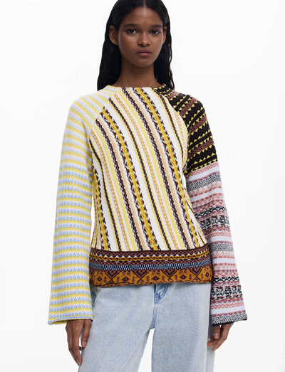 Denne strikkede pullover har et iøjnefaldende mix af mønstre, der giver et særpræget look. De forskellige designs skaber en visuelt tiltalende tekstur, hvilket gør den til et bemærkelsesværdigt stykke tøj i enhver garderobe.