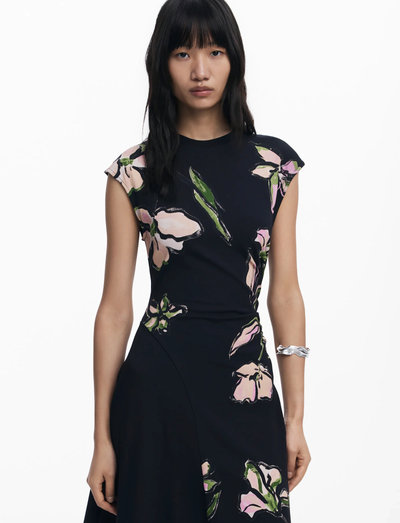 Blomsterdetaljer giver et visuelt interessant udtryk til denne ærmeløse strikkjole. Designet har en flatterende silhuet og en behagelig pasform, hvilket gør den til et alsidigt valg til forskellige lejligheder.