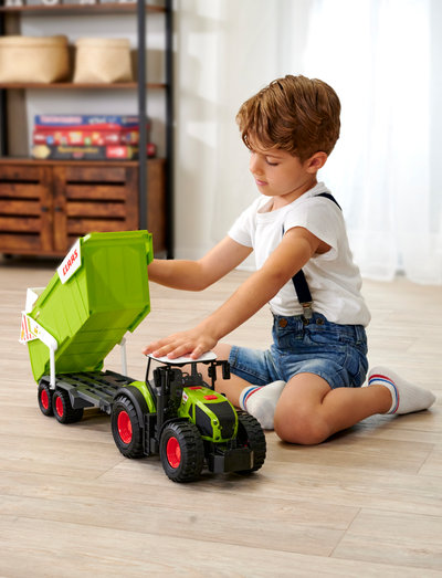 CLAAS tractor from Dickie Toys with free-wheel, interior, light, sound, moving parts, and trailer with tipping function. 64 cm. From 3 years.