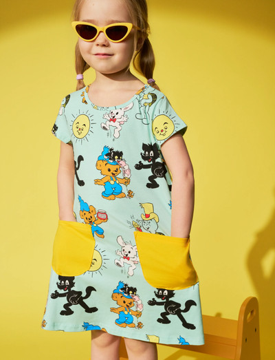 Denne bløde A-linje kjole har et legende motiv og er et behageligt valg til hverdagsbrug. Den er fremstillet af en certificeret økologisk bomuldsblanding og har en rund halsudskæring, korte ærmer og praktiske påsyede lommer.