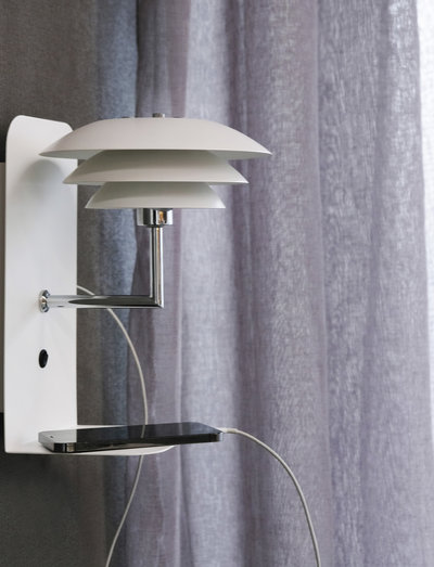 DL20 Hylde med indbygget USB oplader. ON/Off knap er nem at betjene. Lampen er meget brugt som senge lampe, som ekstra lampe i rummet.