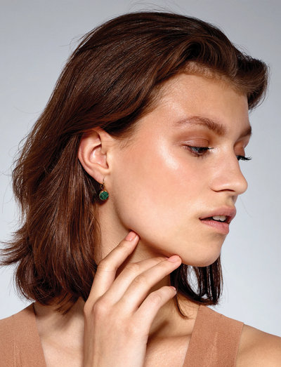LOUISE er vor bestseller ørenring, som vi laver hver sæson i nye farver: En smuk rund facetslebet krystal er sat i en boks fatning og monteret på en lukket ørenkrog. Smykket er designet i poleret messing med kirurgisk stål krog. Længden er ca 20 mm. Her vist i smuk guld tonet og elegant smaragdgrøn sten. Designet i Danmark og fri for cadmium, nikkel og bly.