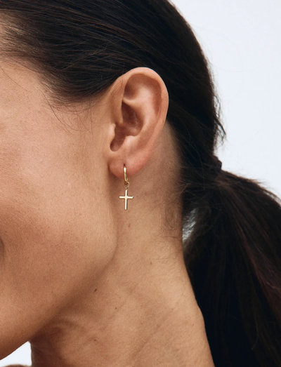 Et klassisk symbol får en moderne opdatering med disse hoops, der har et delikat korsvedhæng. Disse øreringe er udført i en højglans 14K guldbelægning og giver et diskret statement. Designet er nikkelsikkert og vandafvisende.