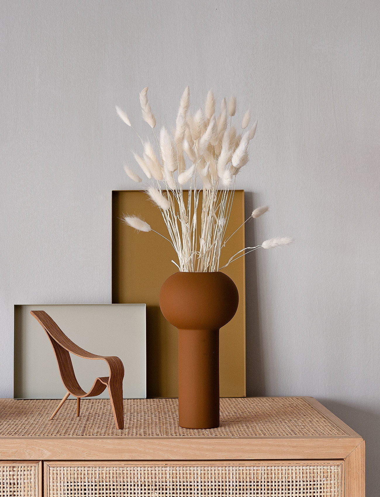 Tørrede blomster er igen blevet trendy, og ikke alene er tørrede blomster og papirblomster dekorative og en nem måde at tilføje farve på, de holder også meget længere end friske buketter. For at skabe dramatik kan du tilføje en statement-vase og en masse små arrangementer rundt omkring i dit hjem.