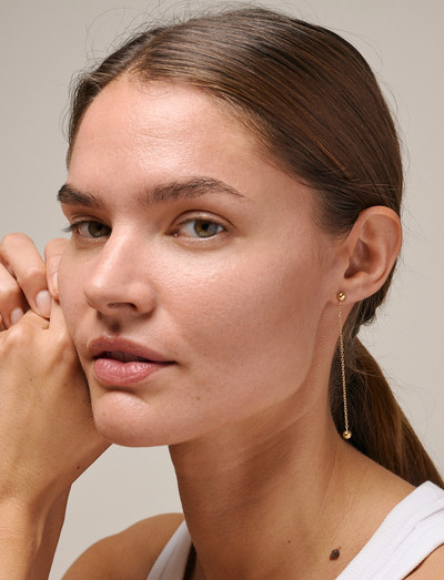 The Balloon earrings are a pair of playful and simple, yet festive earrings. They are lively, with their pendulum-like ball at the bottom, and festive in their elongated design. The shiny surface and the sparkling facets on the chain add exclusivity and elegance to the simple earrings. The Balloon earrings are made of 925 sterling silver, coated with 18 karat gold.
