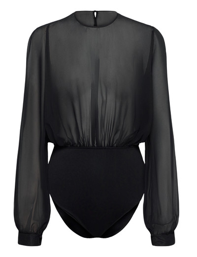This bodysuit plays with transparency and volumes. Made in crepe, it features long puffed sleeves and fastens with delicate buttons at the back.