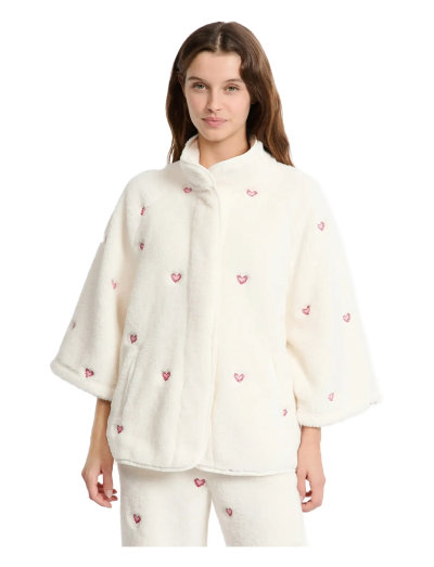 Denne fleecejakke er blød og behagelig og har fine, hjerteformede broderier, der giver et strejf af charme. Det bløde stof sikrer en behagelig følelse, perfekt til afslappende aftener eller hyggelige weekender.