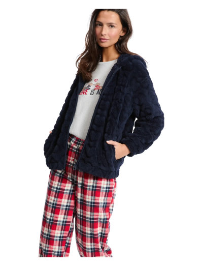 This season's star print, these cotton pants feature a checkered pattern. They pair well with the long-sleeved T-shirt and faux fur jacket from the complete pajama set.