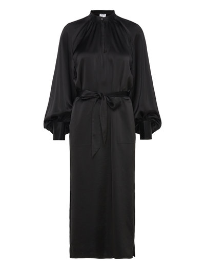 Denne elegante, langærmede kjole har en standkrave og en split foran. Den har samlinger ved kraven og manchetterne, en lappepose foran og et bælte i samme stof. Kjolen har spalter i siderne og er ufor foret.