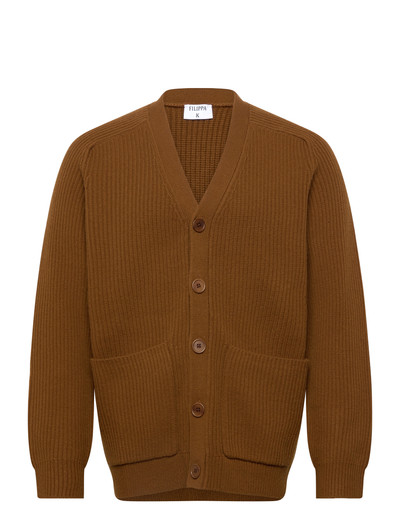 Denne kraftige cardigan er strikket i halvpatentstrik og giver både varme og stil. Den har hammerærmer, en fuld nålestolpe og praktiske påsyede lommer, der er afsluttet med raffinerede corozo-knapper.