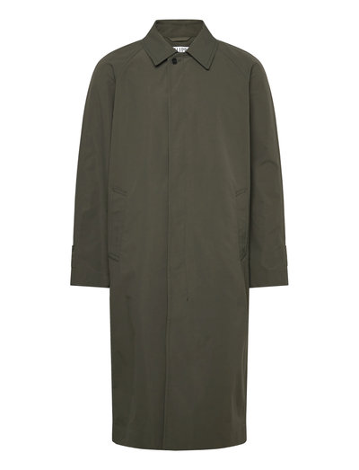 Denne frakke har et strømlinet snit og raglanærmer, der giver god bevægelsesfrihed. Den har også skjult knaplukning, paspolerede lommer foran, ærmestropper med knapper og slids midt bagpå. Frakken er uden for.