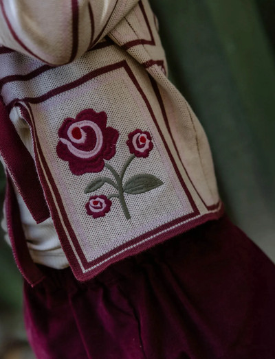 Denne strikkede cardigan har en charmerende lukning med bindebånd foran. Broderede rosenmotiver og bordeauxfarvede detaljer tilføjer et elegant touch. Den er afsluttet med lange ærmer, der giver en fin volumen.