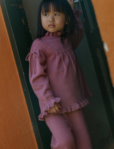 Denne strikbluse har fine flæser ved halsen, ærmerne og kanten forneden, hvilket giver et charmerende og tidløst design. Bindebåndene på skuldrene tilføjer et ekstra elegant touch, mens den løse pasform sikrer behagelig brug. Den er perfekt til særlige lejligheder eller hverdagsbrug og indeholder LENZING™ ECOVERO™ viskose, der stammer fra ansvarlig skovdrift med mindre miljøpåvirkning.