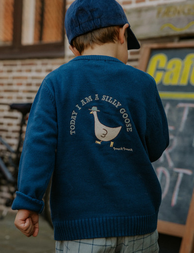 Denne klassiske cardigan er fremstillet af blød bomuld og har lange ærmer og en behagelig, løs pasform. Træ-lignende knapper lukker den foran, mens ribstrikkede detaljer pryder ærmerne, halsudskæringen og bunden. En broderet gås og teksten 'today I am a silly goose' pynter på ryggen og giver et legende præg, hvilket suppleres af en 'quack quack'-brodering på brystet. Denne cardigan er perfekt til lag-på-lag-påklædning på køligere dage.