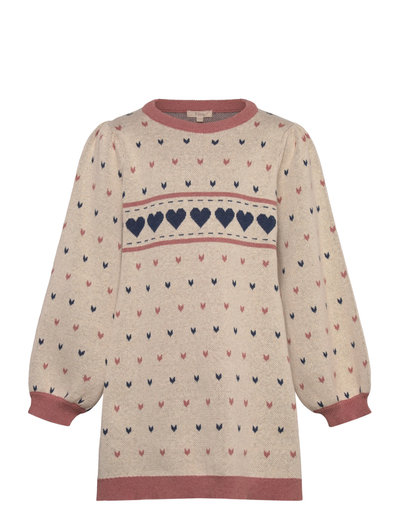 Denne strikkede kjole har et charmerende jacquardmønster med hjerter og en blød og behagelig kvalitet. Den er designet med en klassisk rund hals og stilfulde ballonærmer, der samles ved de ribbede manchetter. Knælængden gør den perfekt til hverdagsbrug.