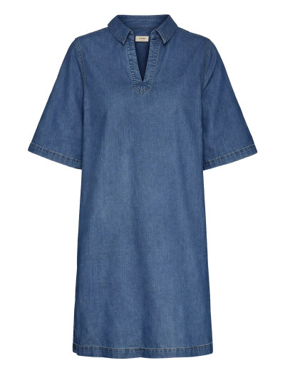 Denne kjole er fremstillet af blødt denim og giver en afslappet og behagelig pasform. Den har en V-udskæring med krave og korte ærmer, hvilket gør den til et alsidigt valg til afslappede udflugter.