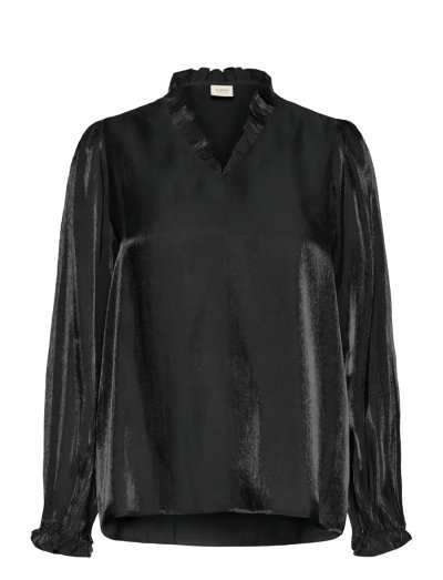 Denne langærmede bluse er fremstillet med en subtil glans og har fine flæser ved halsudskæringen og manchetterne, hvilket tilføjer et elegant touch. V-halsdesignet forbedrer dens sofistikerede appel, hvilket gør den til et alsidigt stykke tøj til forskellige lejligheder.