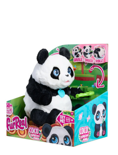 Hvad er sort og hvid og ruller rundt over det hele? Det er furReal Coco Den Koldbøttende Panda! Den superbløde panda har livsglæde og er altid klar til leg. Med over 60 kombinationer af lyd og bevægelse er denne 27 cm plysven altid klar til kildeture, snacks og rul. For at starte legen, skub kontakten fra TRY ME til ON. Kild hendes højre fod for at aktivere fnis og bevægelser. Fortsæt, og se Coco rulle rundt af grin. Kæl hende på hovedet for at se hende sætte sig op selv. Tryk på sensoren på hovedet for at se et par rul – dobbelttryk og se hele 5 rul i træk! Alt det rullen gør Coco sulten. Giv hende flasken i munden, og hør hende drikke. Løft bambus-grenen mod hendes mund og hør tygge-lyde. Hold sensoren på hovedet nede – Coco vil kramme og falde i søvn i barnets arme. Saml flere furReal plys-kæledyr for endnu mere dyreleg (sælges separat). En “panda-tastisk” gaveidé til børn og dyreelskere fra 4 år og op.