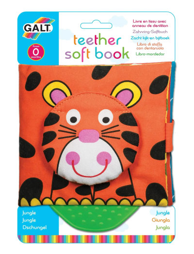 Soft book with pictures of jungle animals. The pages are crumbling and have fun details. There is a chew toy at the bottom of the book. 0+