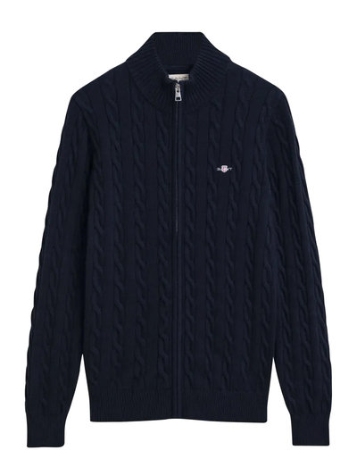 Denne cardigan har en fuld lynlås og et kabelstrikket design, der giver både stil og komfort. Det broderede grafik på brystet tilføjer en subtil brandingdetalje, mens unisex-pasformen gør den til en alsidig tilføjelse til enhver garderobe.