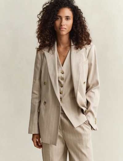 Denne dobbeltradede blazer har et nålestribet design og giver en sofistikeret silhuet. Revers med spids giver et strejf af klassisk skrædderkunst, mens det fulde for sikrer en behagelig pasform. Denne model er skåret i en almindelig pasform og er ideel til både professionelle og smarte hverdagsbegivenheder.