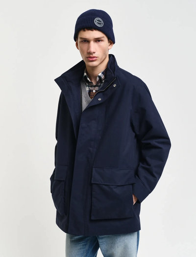 Denne alsidige jakke giver dig to looks i én, takket være det aftagelige inderlag. Den ydre jakke har en skjult hætte i kraven, lynlåslukning foran og praktiske sidelommer med klap. Den indvendige jakke har lynlåslukning, paspolerede lommer og elastiske manchetter. Begge dele er udsmykket med det ikoniske GANT-logo broderet på brystet. En slidstærk vandafvisende (DWR) finish hjælper med at afvise vand i let regn.