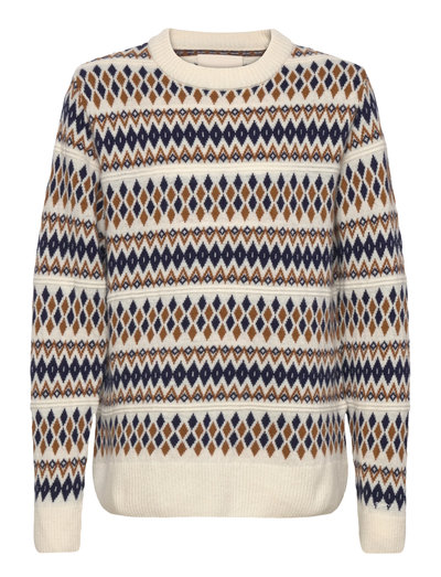 Denne sweater med det klassiske Fair Isle-mønster har både varme og stil. Den er fremstillet i et regular fit og afsluttet med ribkanter ved ærmer og forneden for en behagelig fornemmelse. For de bedste resultater vaskes den på vrangen med lignende farver og uldvaskemiddel, og formes derefter, mens den er våd.