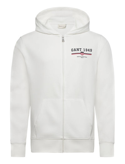 Denne Gant 1949 grafiske hættetrøje med lynlås er et komfortabelt og stilfuldt valg. Den har lynlåslukning og et klassisk hættetrøjedesign. Hættetrøjen har en kængurulomme og ribkantede manchetter. Denne hættetrøje er perfekt til hverdagsbrug.