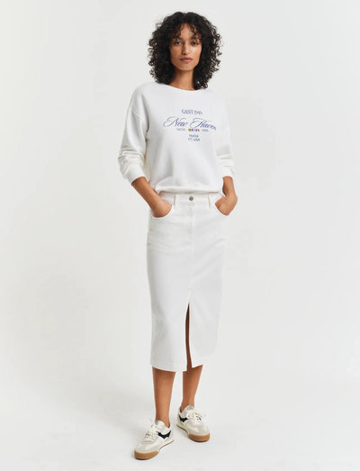 Denne denimskørt er et klassisk stykke, der kan styles op eller ned. Den har en midi-længde, en forreste slids og en høj talje. Skørtet er lavet af et behageligt og holdbart denimstof.