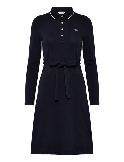 Denne polo-kjole har en knælang silhuet og lange ærmer, hvilket giver et elegant udtryk. Den er afsluttet med en ribstrikket polokrave, imiterede perlemorsknapper og en diskret grafik på brystet.