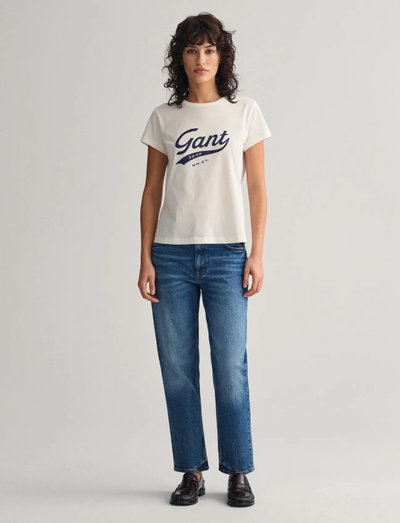 Straight fitDesigned for your everyday, these straight leg jeans from GANT are made from cotton with a touch of stretch. These jeans are designed for a regular fit that's snug over the hips with a high-rise waist and cropped leg. Designed in a mid-indigo wash with expressive details, they are complete with branded donut buttons and a leather GANT logo patch at the back.