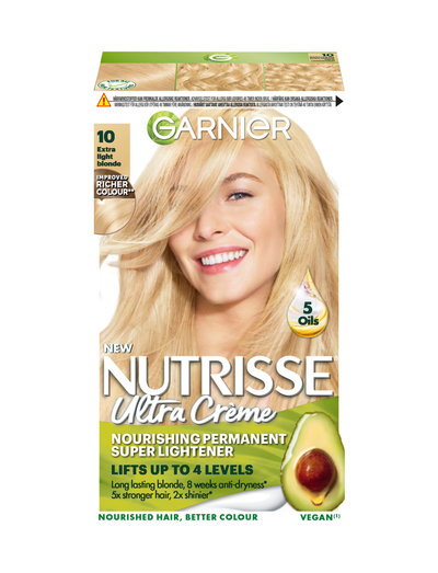 Garnier Nutrisse Ultra Crème 9.0 Meget Lys Blond er en intenst nærende permanent hårfarve der giver en rig farve som holder længe og dækker grå hår 100%. Formlen er beriget med 5 olier for intens næring, og dit hår efterlades 5x stærkere og 2x mere skinnende(2).