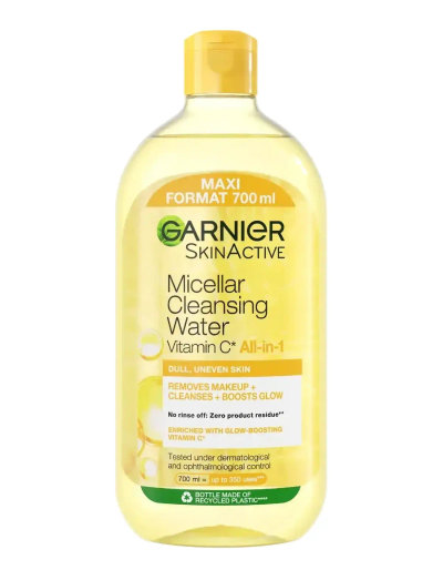 Garnier SkinActive Vitamin C* Cleansing Water er et renseprodukt med miceller som effektivt fjerner snavs, makeuprester og solprodukter. Formlen er beriget med C-vitamin* som beroliger huden og får den at stråle. Passer alle hudtyper der mangler glød. Brug produktet på hele ansiktet, også øjne og læber. Påfør med en vatrondel uden at gnide. Skal ikke skylles af. Beriget med glødgivende C-vitamin*.