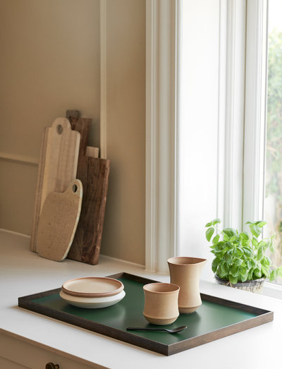 Frame er blevet relanceret med tre nye farver, herunder en smuk grå, en forførende grøn og en elegant beige. For at tilføje endnu mere variation omfatter kollektionen også muligheden for at vælge mellem en eksklusiv egetræskant og en kant i røget eg. De tre forskellige størrelser gør det muligt at vælge den ideelle Frame til ethvert behov, hvad enten det er til udstilling af genstande eller som praktisk serveringsbakke. Den nye kollektion af Frame med dens varierende farver og trærammer giver gode muligheder for at udtrykke personlig stil og tilføje et strejf af elegance og funktionalitet til ethvert rum. Uanset om det drejer sig om at præsentere kunstværker eller servere forfriskninger, er Frame den perfekte løsning. "Navnet 'Frame' henviser til ideen om at indramme noget, der kan præsenteres som en udstilling eller et stilleben. Samtidig kan det fungere som en serveringsbakke, hvilket giver Frame en udvidet funktionalitet."