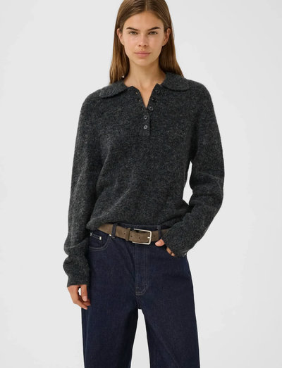Denne strikkede pullover har en raffineret silhuet med en klassisk polokrave og en knaplukning. Det langærmede design og hoftelængden gør den til en alsidig tilføjelse til enhver garderobe.