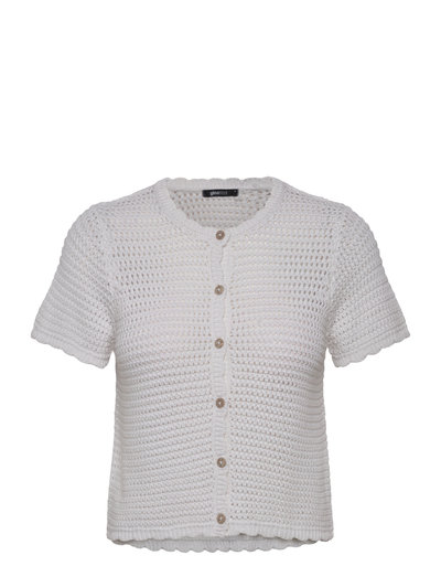 Delikat hækle strik giver denne cardigan en let og luftig fornemmelse. De korte ærmer og knaplukningen gør den til et alsidigt lag-på-lag stykke.