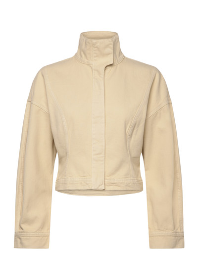 Denne denimjakke har en opretstående krave og en beskåret længde, hvilket giver en moderne silhuet. Det strukturerede design suppleres af definerede sømme, der tilføjer et strejf af detalje til dette alsidige stykke.