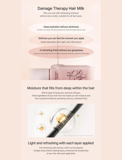 Growus Damage Therapy Hair Milk er en let leave-in behandling, der fugter og beskytter tørt, skadet hår. Med otte typer hyaluronsyre og chitosan fugter den, glatter krus og giver glans uden at tynge håret. Velegnet til fint og krusende hår.