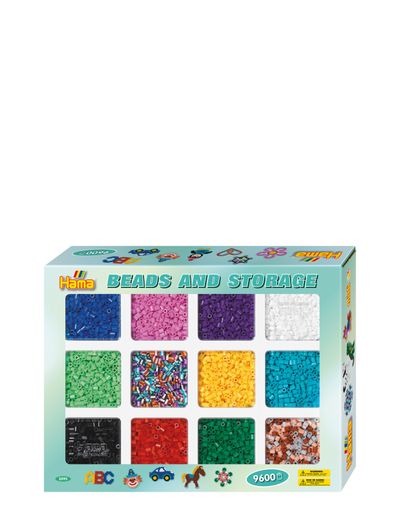 Approx.9.600 beads distributed on 10 different colours and 2 mixed colours. Ironing paper and 1 storage tray with lid.