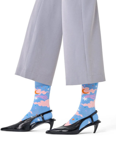 Med et drømmende nattehimmelmotiv tilføjer disse sokker et strejf af legende charme til ethvert outfit. Bløde skyer og blinkende stjerner skaber et fængslende design, perfekt til at tilføje lidt sjov til din dag.