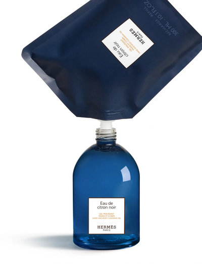 Refillen er fuldt genanvendelig og kan bruges til at fylde glasflasken med Eau de citron noir skummende gel i samme størrelse.