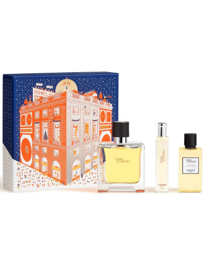 Gaveæsken indeholder en parfum Terre d’Hermès med 75 ml, en parfum Terre d’Hermès nomade med 15 ml og en brusegel og shampoo med 40 ml.