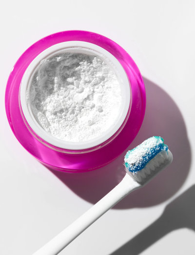 - Uden tandpasta: Skyl tandbørsten, og ryst overskydende vand af. Dyp din tandbørste i pulverkrukken, så børsten bliver jævnt belagt. Børst grundigt i 2 minutter. Spyt ud og skyl munden med vand efter brug.